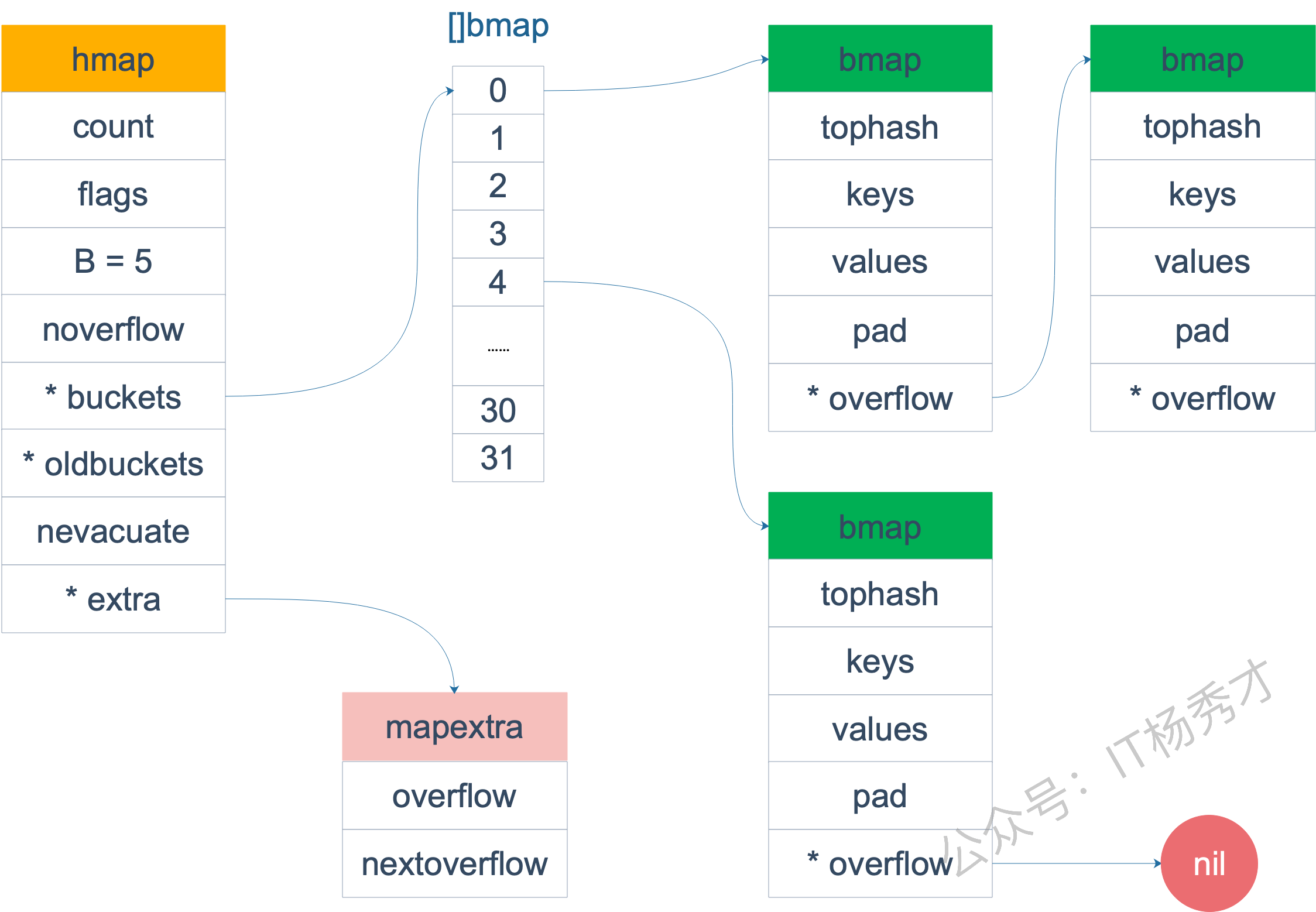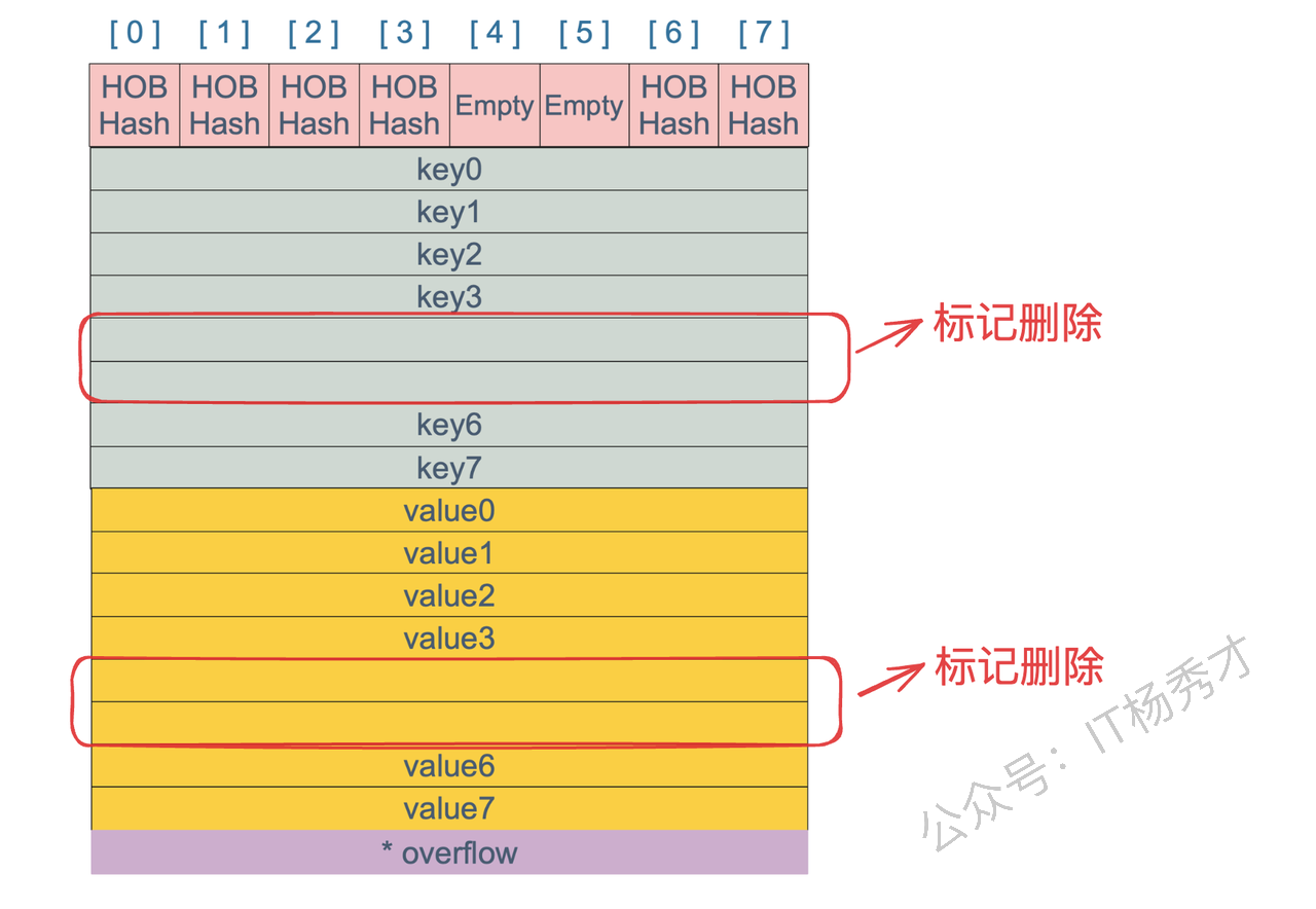 4每个桶:[key/val][key/val][key/val]... (最多8个) → 溢出桶 → ...