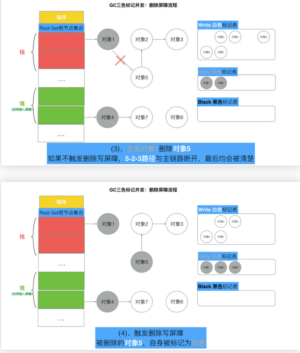 具体操作: 被删除的对象,如果自身为灰色或者白色,那么被标记为灰色。