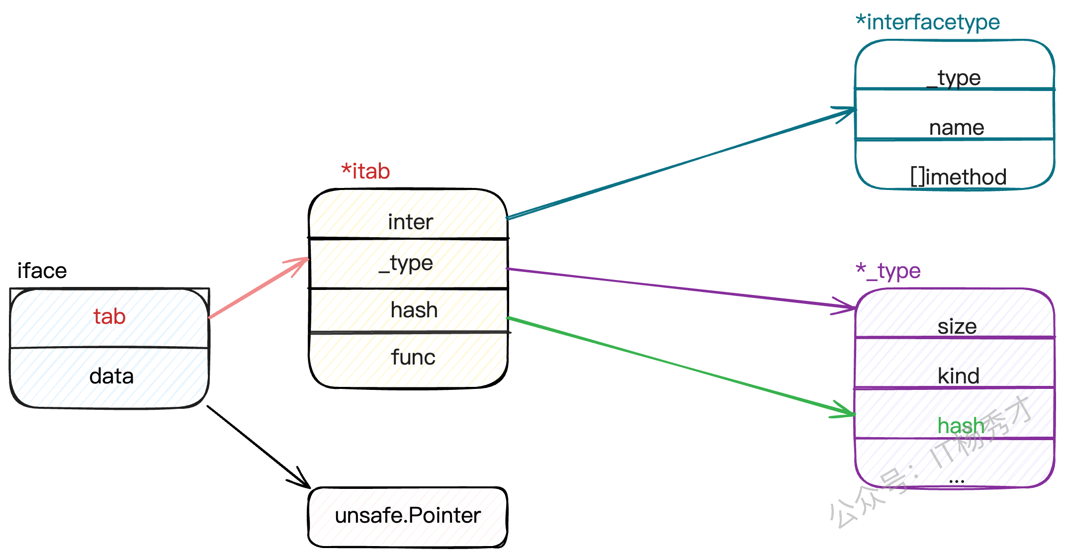 非空接口 itab是核心,存储了接口类型、具体类型(动态类型)、方法表 方法表是个函数指针数组,保存了该类型实现的所有接口方法的地址