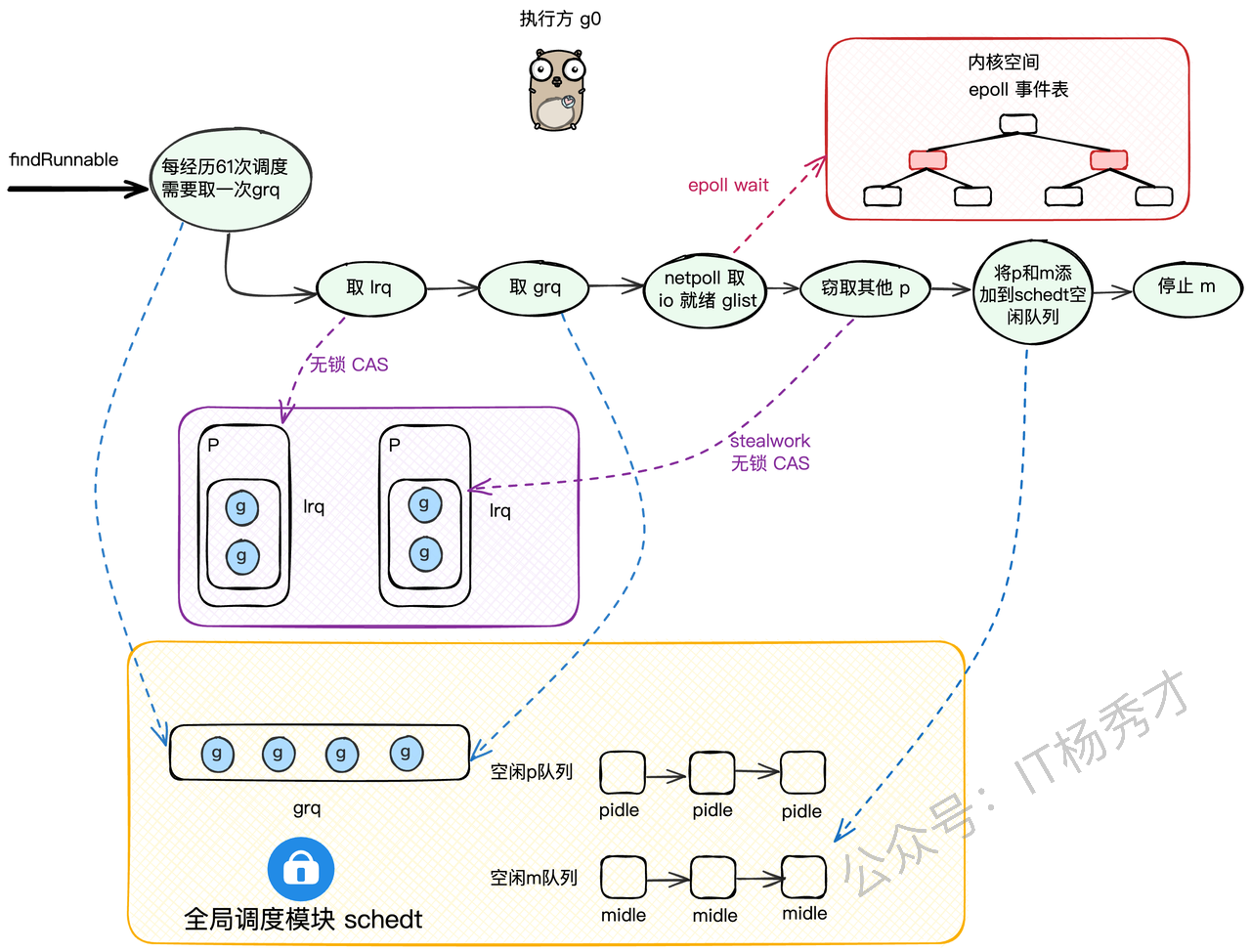- 用CAS高效查本地队列,从当前P的LRQ里runqget一个G