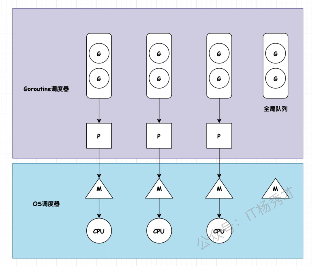 就是生产消费者模型嘛 G:goroutine协程 M:machine系统线程,真正干活的 P:processor逻辑处理器,负责调度G(承载 G 队列、绑定 M、提供调度上下文)